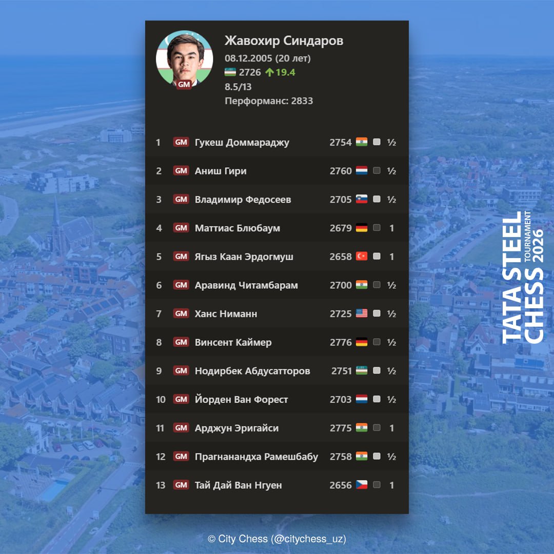 Шахмат оламидаги энг нуфузли турнирлардан бири — анъанавий тарзда Нидерландиянинг Вейк-ан-Зее шаҳрида ўтказиладиган Tata Steel Chess 2026 мусобақасида Нодирбек Абдусатторов чемпионликни қўлга киритди.