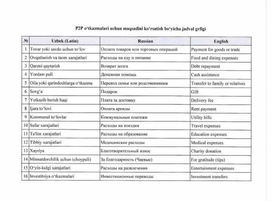 Унка кўра, энди барча банк ва тўлов иловалари орқали пул ўтказишда махсус меню пайдо бўлади. Бунда фойдаланувчи маблағ юборишдан олдин таклиф этилган 16 та банддан бирини, жумладан, «совға», «оилага ёрдам», «ёрдам пули», «ижара тўлови» ёки «хайрия» каби тоифаларни танлаши кера болади.