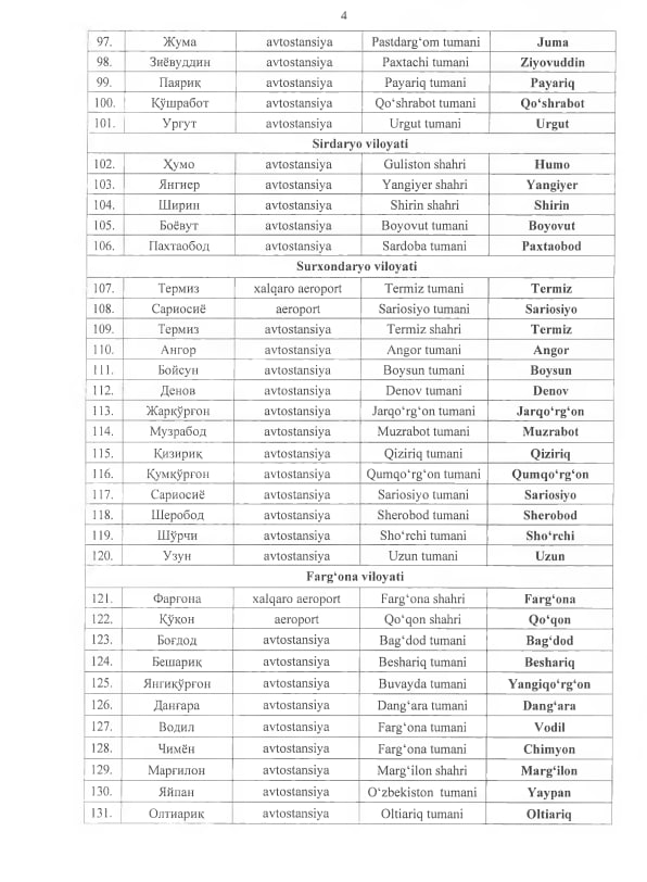 Nomlari davlat tili qoida va me’yorlariga muvofiqlashtiriladigan aeroportlar, avtovokzallar va avtostansiyalar ro‘yxati quyidagicha: