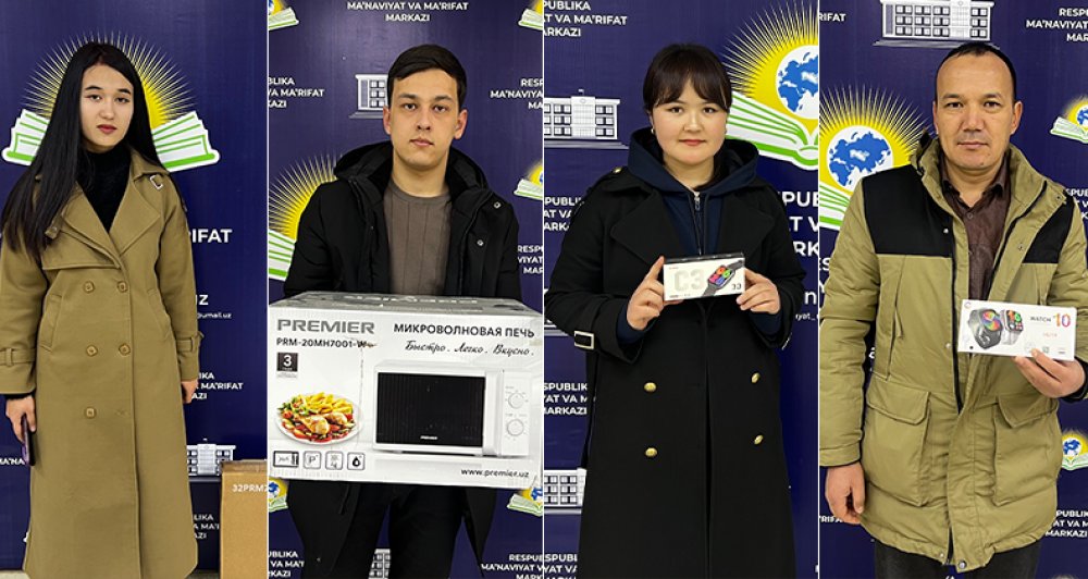 Jami 400 nafarga yaqin ishtirokchi qatnashgan viktorinada gʻoliblar aniqlanib, taqdirlandi. Viktorinada 1-oʻrinni Zohirova Shodiya, 2-oʻrinni Mahbuba Nusratova, 3-oʻrinni Gulzoda Hayitova, 4-oʻrinni Nodira Begmatova, 5-oʻrinni Akbar Hayitov qoʻlga kiritdi.