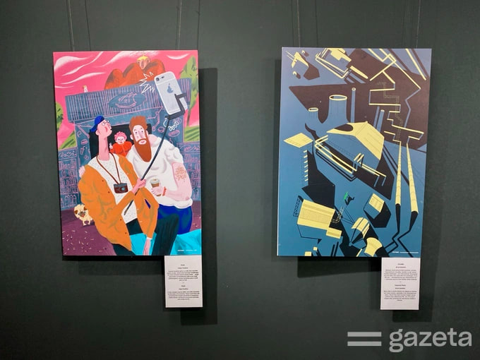 Toshkentdagi ekspozitsiyada kollaj, applikatsiya va vektorli grafika texnikalarida mahorat bilan bajarilgan 60 dan ortiq ishni ko‘rish mumkin. Rassomlar, illyustratorlar va grafik dizaynerlar tarixiy voqealar, hudud va shaharlarning o‘ziga xos xususiyatlari, madaniy obyektlar va an’analar, ijtimoiy hodisalar hamda hatto urush yillarida ham biznikiga juda o‘xshash bo‘lgan ukrainlarning kundalik hayotiga doir turli qarashlarni taklif etadi.